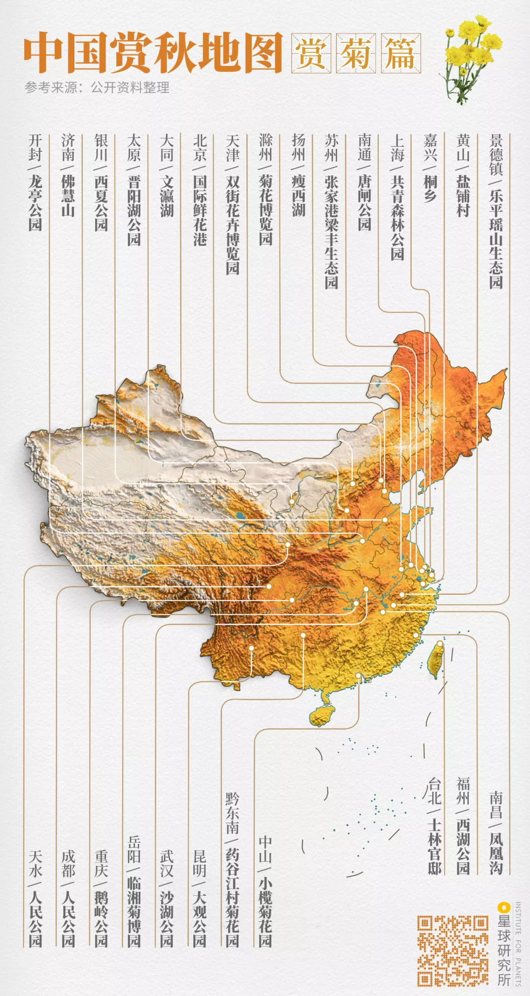 (中國賞秋地圖⎜賞菊篇,製圖@鄭藝&鄭伯容/星球研究所)