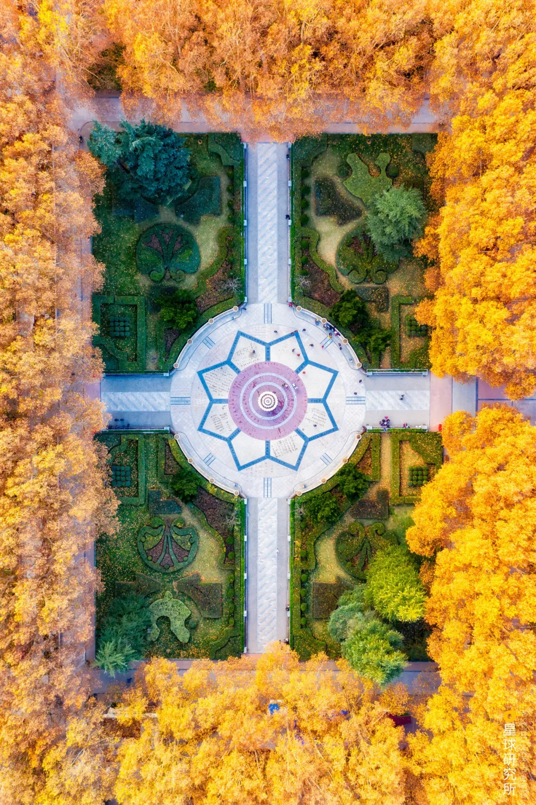 (出自清朝納蘭性德《如夢令》;下圖為鄭州人民公園,法桐(懸鈴木)已然金黃,廣場中央的樹木仍顯蒼翠,攝影師@焦瀟翔)