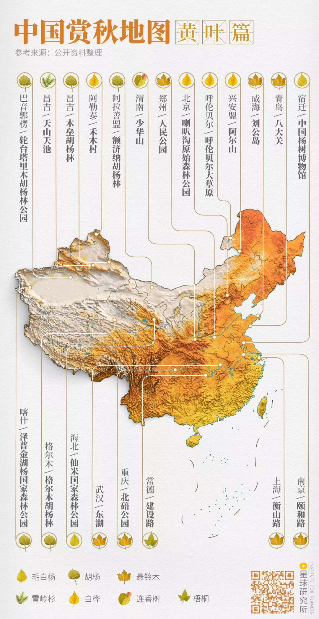 (中國賞秋地圖⎜黃葉篇,製圖@鄭藝&鄭伯容/星球研究所)