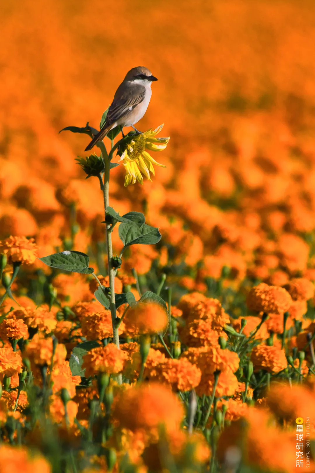 (出自宋朝錢時《立冬前一日霜對菊有感》;下圖為新疆博樂菊花種植園,一隻小鳥站在菊花叢中的向日葵之上,攝影師@賴宇寧)
