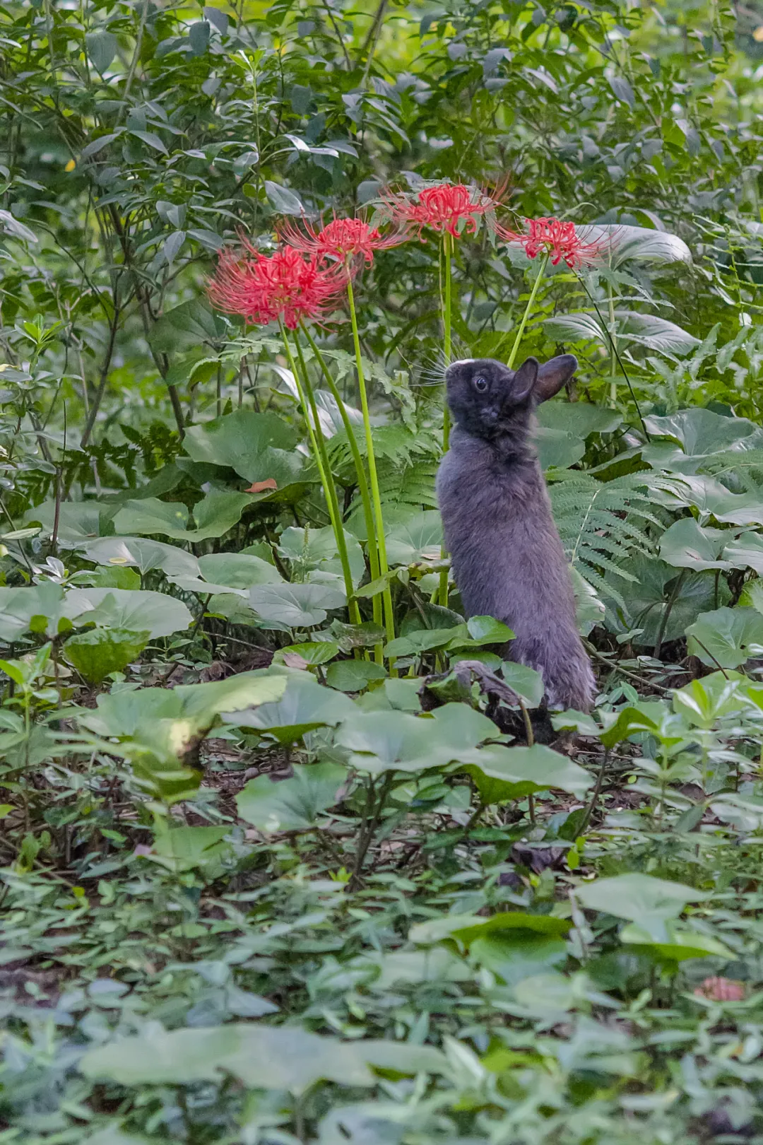 (出自明朝謝復《秋香徑》 ,圖為一隻野兔在石蒜花下駐留,石蒜又名彼岸花、曼珠沙華,是我國南方野外常見的一種秋花植物,圖片來源@視覺中國)