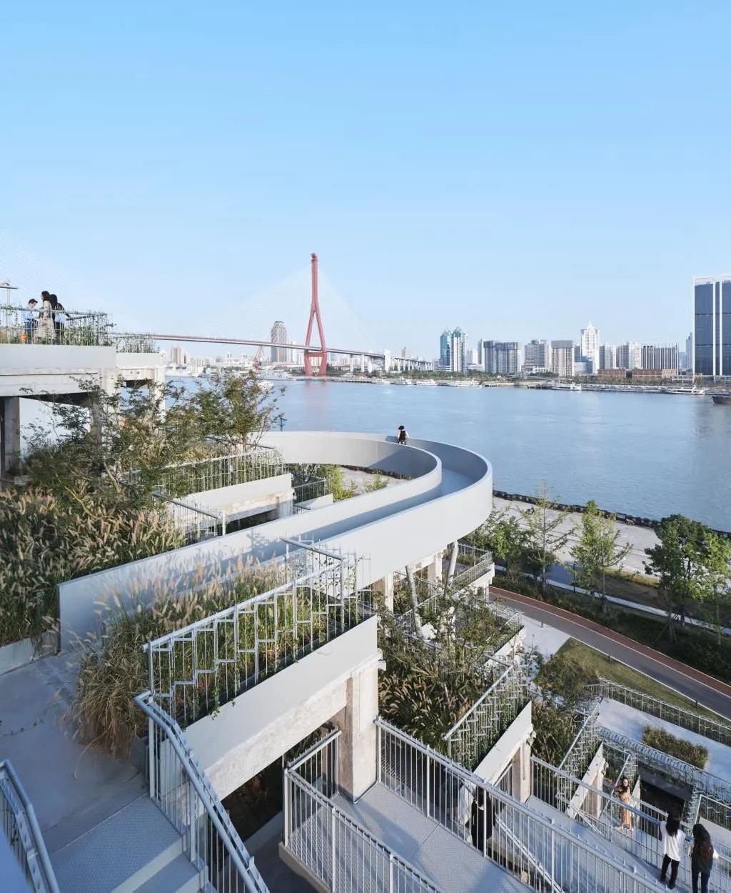 在“綠之丘”,人的表達格外明顯。在一個綠意盎然、能夠眺望江景的建築上,人可以脱離機械化的繁忙日常,在城市環境中“遊蕩”,抑或坐下來享受空閒。在這個過程中,人可以找到舒適、安心的場所,也找到一個弱小的自己。建築本身的弱目的性,同樣帶來一種暗示:享受沒有目的的快樂和人生是被允許的。