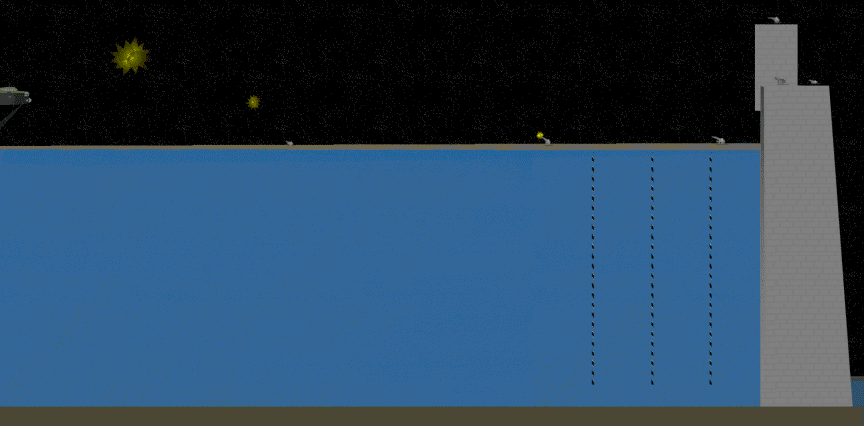 彈跳炸彈的原理與打水漂類似。它也是圓柱體的形狀,在嚴格計算了飛機速度和投彈高度的情況下,可以讓低空飛行投出的炸彈在水面多次彈跳、繞開魚雷網後擊中水壩。靠着這種炸彈,最終英國空軍成功擊潰了德國魯爾區的三座水壩,完成了這次作戰行動。
