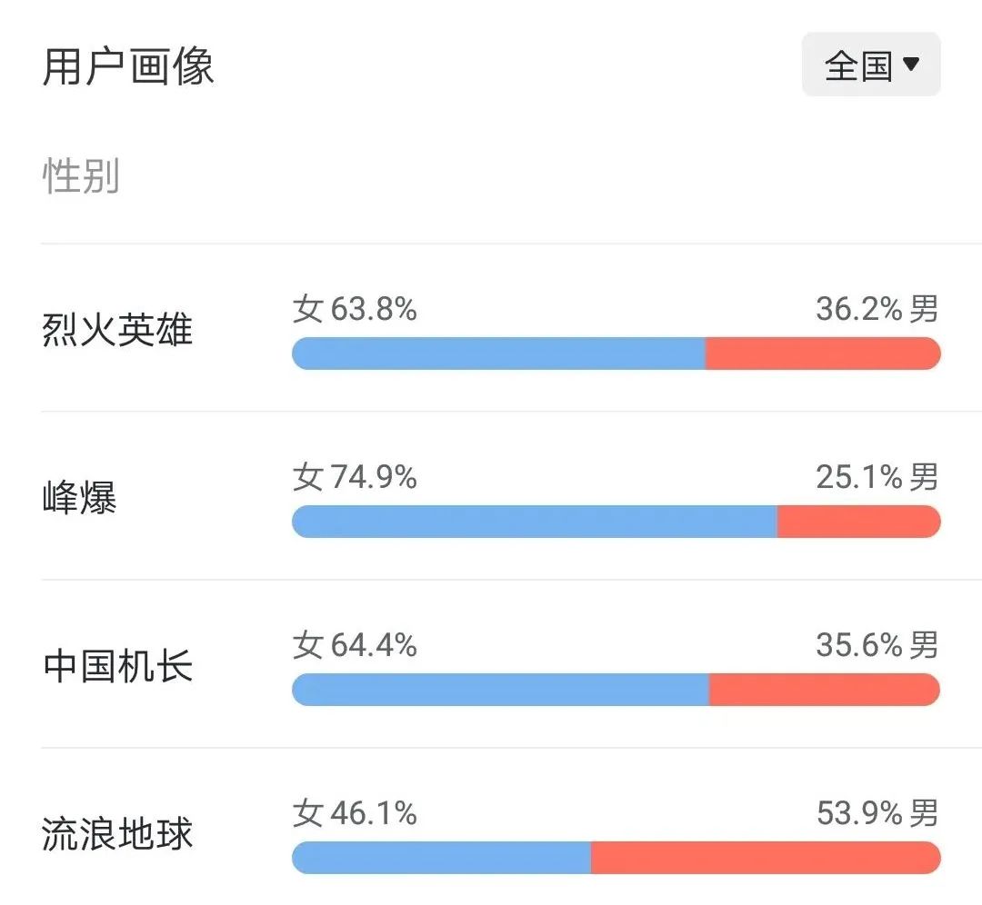 出現《峯爆》這樣的現象,很大程度上是因為主演的粉絲羣體成了影片的首批觀影人羣,這也意味着《峯爆》目前還沒有真正破圈。相較於其他災難類影片,《烈火英雄》《我的機長》女性觀眾佔比都在64%上下,而《流浪地球》這一數據僅46.1%。若《峯爆》在之後不能持續驅動更多粉絲外人羣走進影院,拉低女性用户佔比,也將直接影響其未來的票房走勢。