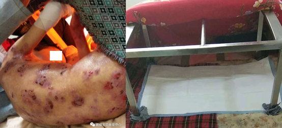 最讓周迎春震撼的是湖南一位10歲的患兒。當地醫生沒有經驗,家屬更是束手無策。為了防止傷口粘連,他已經連續幾年沒有穿衣服,渾身赤裸。冬天也不能蓋被子,患兒父母自制了一個“隔層牀”,被子懸在上方。