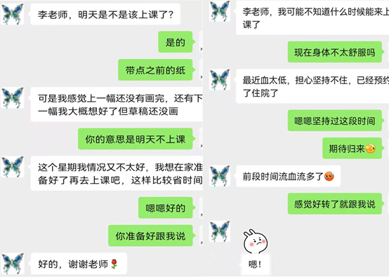 李秋實至今還保存着周密最後發給他消息。那是今年5月,病重的周密已無法出門,她告訴李秋實,身體已越來越不允許她過來上課,想在家裏自己構思創作。