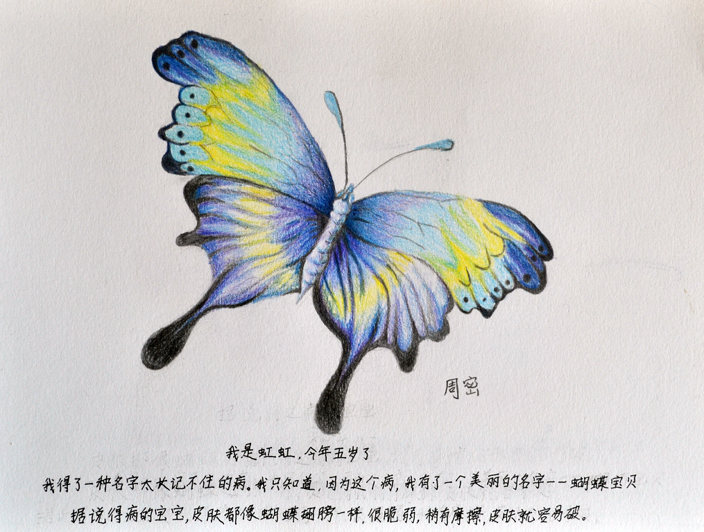 得了這種病的人被稱做“蝴蝶寶貝”,他們的皮膚和蝶翅一樣脆弱。只要與外界觸碰,皮膚與黏膜就會不同程度地出現破損與水皰。沒有根治的手段。