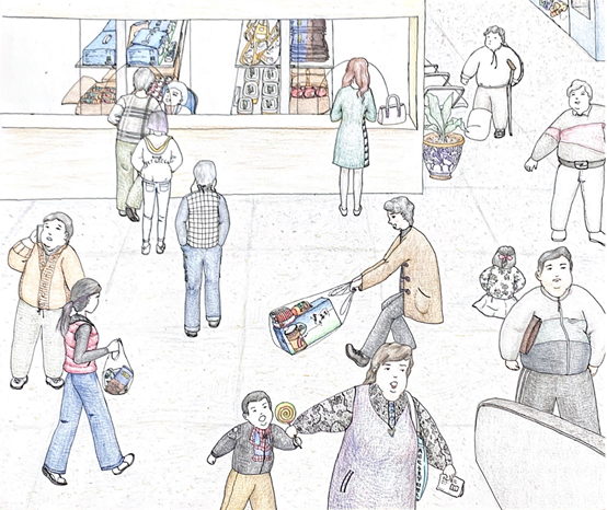 《醫院裏的藥房》是周密人生的最後一幅畫,她畫了1個月,裏面各式各樣的人物顯得俏皮而又生氣勃勃。她告訴李秋實,自己是想要畫得可愛一點。