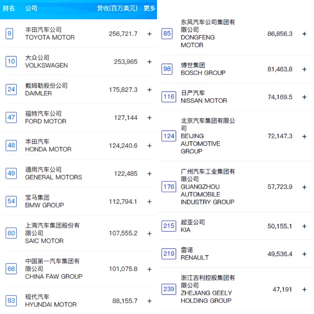 2020年中國乘用車市場生產了1999萬輛,銷售2017萬輛。有六家汽車公司闖入世界五百強,上汽和一汽的營收甚至遠超現代、日產,比肩寶馬集團。