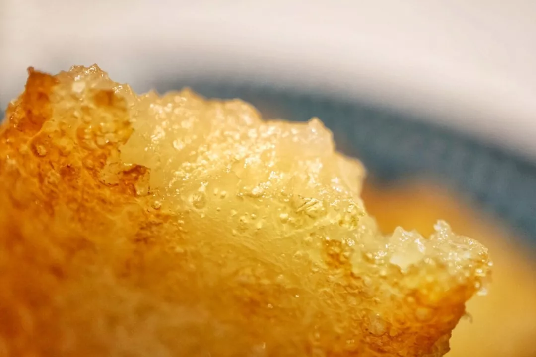 第三種是在前文油皮餅的基礎上,加入了糖漿和鹼。糖漿可以為餅皮上色,讓烘烤後的成品帶着漂亮的棕紅色澤,並延長保質期。鹼能讓麪粉裏的蛋白質(麪筋)改性,在獲得鬆軟口感的同時,增強筋力,使得餅皮更薄、承載的餡料更多。本質上來説,這與蘭州牛肉麪里加蓬灰、潮汕酥面里加面鹼是同一種食材處理邏輯。但用於月餅的酥皮,是劃時代的創舉。