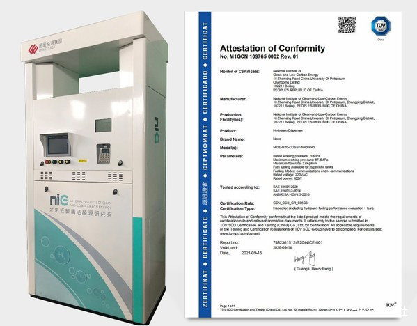 北京2021年9月18日 /美通社/ -- 9月15日,由國家能源集團北京低碳清潔能源研究院(簡稱“低碳院”)開發的70MPa加氫機正式獲得國際知名認證機構TUV南德的認證,這是國內70MPa加氫機首次取得相關國際認證。7月28日至8月11日,低碳院70MPa加氫機接受並順利通過了該機構的相關認證測試。