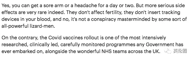 漢考克説:**“是的,接種完疫苗的一兩天內可能會手臂痠痛或頭痛,更嚴重的副作用出現的概率很罕見。****疫苗不會影響你的生育能力,不會在你的血液中插入追蹤裝置,也不是蜥蜴人們策劃的陰謀。**新冠疫苗的推出是政府和出色的NHS團隊一起展開最深入研究,完成臨牀主導和仔細監測之後的產物。”