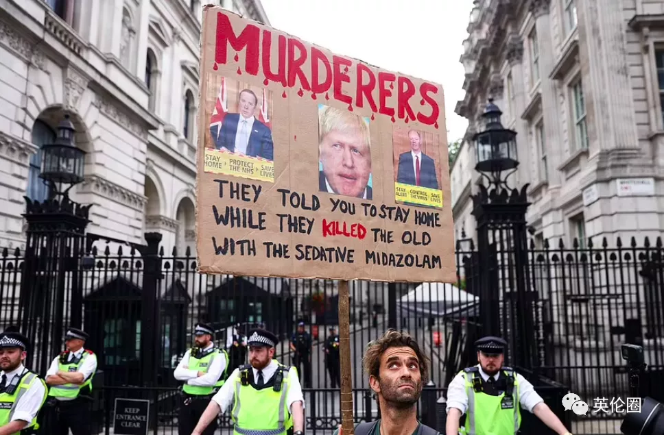 示威者們高呼“逮捕鮑里斯·約翰遜和克里斯·惠蒂”,舉着各種標語: