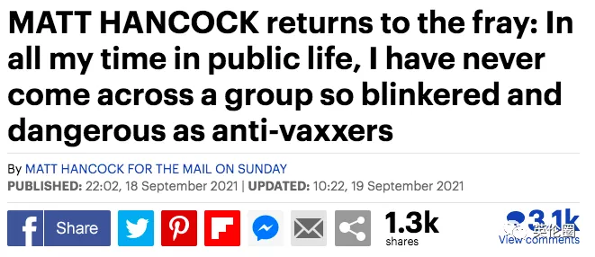 **當天下午倫敦警方推特發文稱有兩人因為刑事破壞和聚眾鬥毆被逮捕。**英國前衞生大臣馬特·漢考克在《每日郵報》上刊發評論,抨擊了反疫苗抗議者們的種種行為: