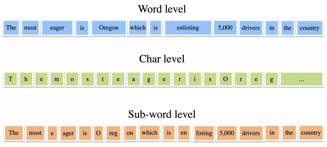 舉個例子,一個句子是:The most eager is Oregon which is enlisting 5000 drivers in the country(最積極的是俄勒岡,它在國內招募5000名司機)。我們需要首先把這句話劃分成若干個單元,每個單元對應一個編碼,然後把這串編碼輸入神經網絡。