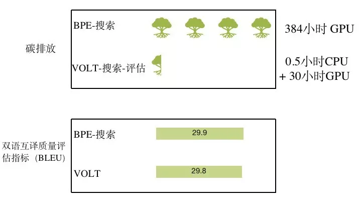 詞表的節約,帶來能量的節約。同樣的搜索和評估工作,BPE需要運行384小時的GPU,而VOLT只需要半個小時的CPU加30小時的GPU,相當於少砍很多樹。在這個意義上,這是一個綠色環保的成果。