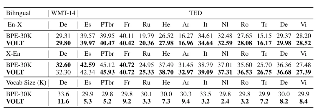 來看下面這個圖。字節跳動的軟件叫做VOLT,跟它對比的BPE-30K是目前業界最常用的設置,這個圖就是VOLT和BPE-30K對於英語和其他若干種語言互相翻譯的對比,黑體是表示哪一方勝出。最上面兩行是英語到其他語言的翻譯,中間兩行是其他語言到英語的翻譯,可以看到大部分是VOLT表現更佳,不過相差不大。最下面兩行是詞表的大小,這個差別就大了。例如對於英德翻譯,BPE-30K的詞表有33.6 K,而VOLT的詞表是11.6 K,只有前者的1/3。