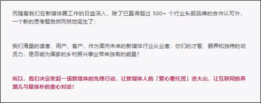 這個所謂的支教活動,目的是“讓新媒體人和互聯網弄潮兒與最質樸的童心對話”,為的是背後“千千萬萬留守兒童成長的可能性”。