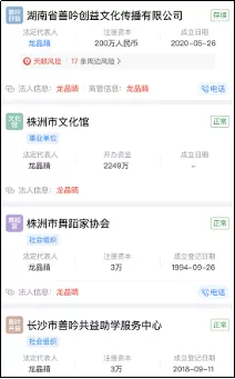 龍女士還有另外一個高大上的身份——青年企業家。烏鴉在天眼查上搜索顯示,龍女士的名下,有一家湖南省善吟創益文化傳播有限公司,還有一個長沙市善吟共益助學服務中心的社會組織。