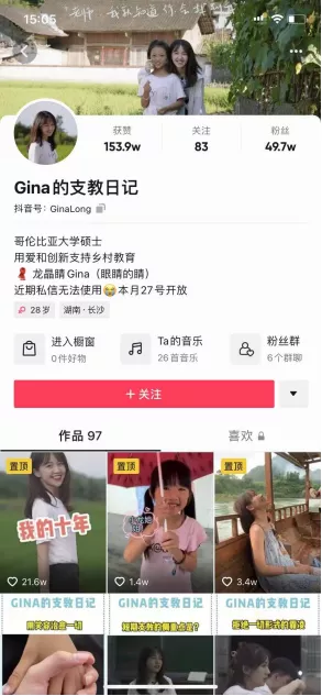 打開龍晶睛的抖音,一共有97條視頻內容,幾乎全都是她的支教視頻日記。