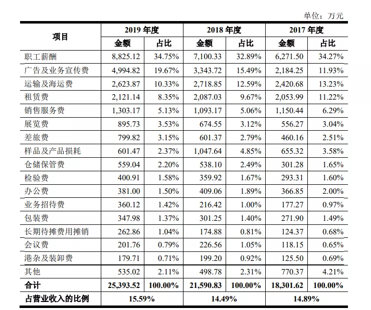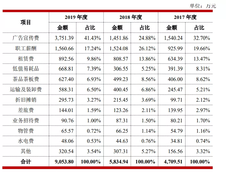 與此同時,較為有趣的是八馬茶業的銷售費用結構區別於同行,2019年其薪酬支出與租金水電支出佔銷售費用比例為43.94%與18.45%,而瀾滄古茶為17.24%與0.53%,中國茶業則為8.35%。