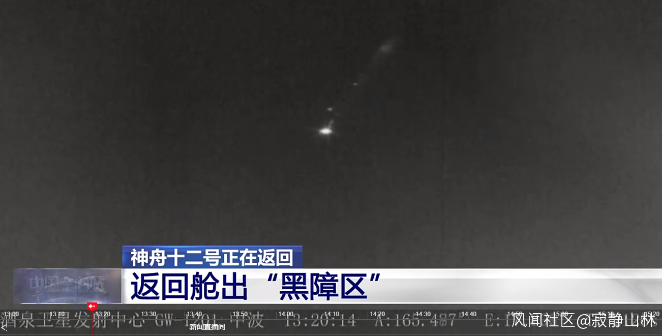 13:15′03″,直播畫面出現了一個光點,這是返回艙進入直播視線的第一個畫面,多麼珍貴呀,主持人只有一句解釋:進入“黑障區”了,嘉賓説,是光學圖像。這不廢話嗎?然後呢?然後就是主持人調侃:只能看到“髮型”,再然後呢?就是科普摩擦温度,再然後聽到控制室説“回收兩號發現目標”,此後控制室不斷傳來“某某跟蹤結束”的口令;嘉賓惜字如金,只説“地面4個測控站跟蹤” ,“段子手”調侃“髮型”。你是專業嘉賓呀,多説幾句不行嗎?網上查,黑障區高度大約35km到80km,**也就是説,那個光點出現在8萬米高空!我們這4個監控在哪裏?首次看到的這個監控是怎麼做到的?當時的再入點離地面大約是多少km?它可以被跟蹤監視到多少km?以往發射的時候,監控也只能做到幾km吧?這是多麼大的進步啊。**還有,用了北斗嗎?如果沒用,為什麼不能用?這些增強直播感的話,嘉賓就是不説,急死你;