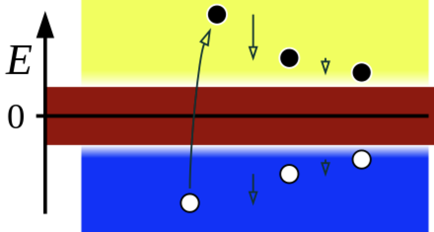 理論上來説,時空佔滿了整個宇宙,其中一種闡釋由狄拉克海指出。對於一個小範圍的空間,這一圖景如下圖所示:E 表示能量,物質粒子擁有正的能量而反物質粒子有負能量。