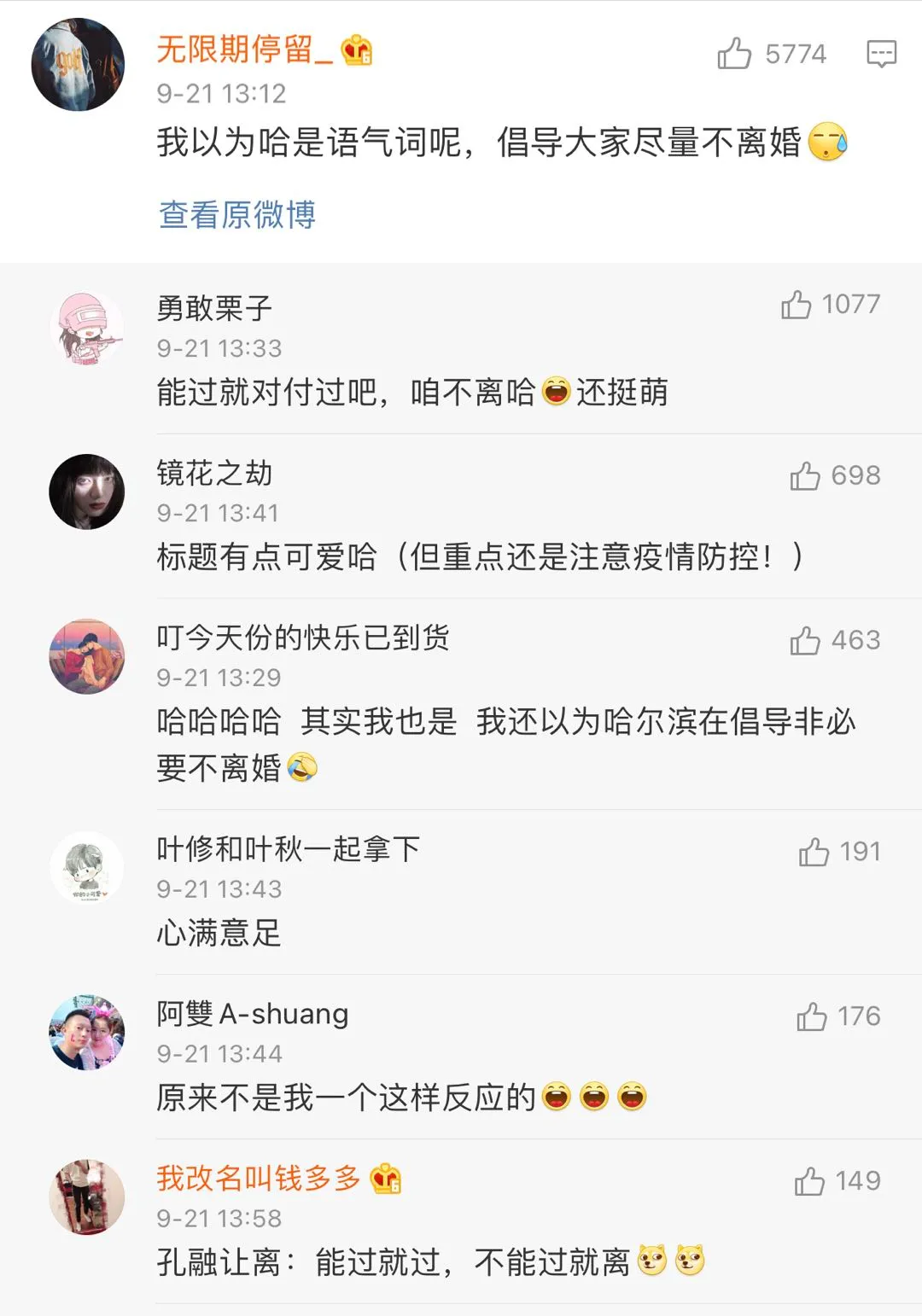 這句“非必要不離哈!”把不少網民逗樂了:“我以為哈是語氣詞呢,倡導大家儘量不離婚!”