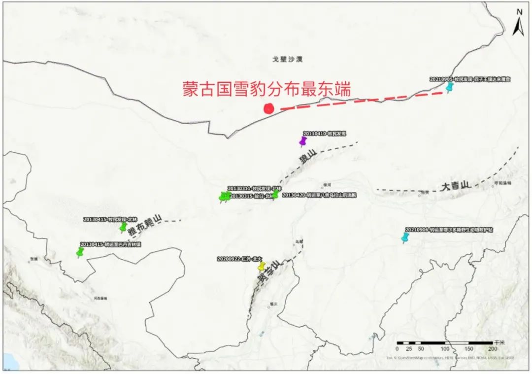 製圖:陸橋生態保護中心,李禕斌;蒙古雪豹分佈最東端位點信息來自Justine