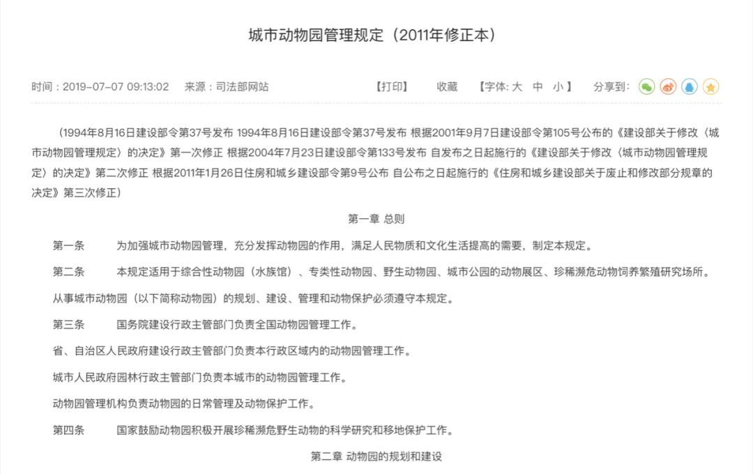 同時,《中華人民共和國陸生野生動物保護實施條例》中也強調,“動物園需要申請捕捉國家一級保護野生動物的,在向國務院林業行政主管部門申請特許獵捕證前,須經國務院建設行政主管部門審核同意”。