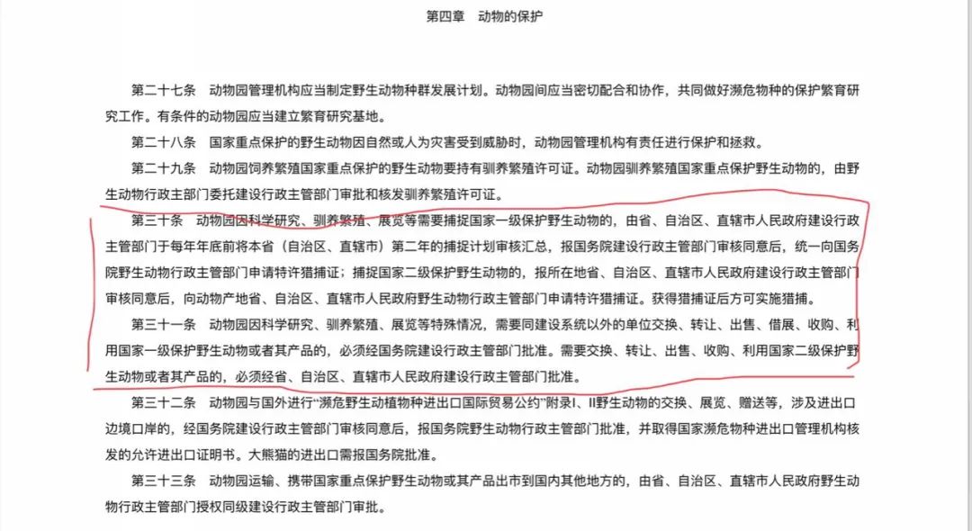 “動物園因科學研究、 馴養繁殖、展覽等特殊情況,需要同建設系統以外的單位交換、轉讓、出售、借展、收購、利用國家一級保護野生動物或者其產品的,必須經國務院建設行政主管部門批准。”