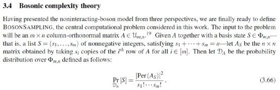 那麼九章究竟是幹什麼的呢?我簡單地解釋一下:九章是一台光量子計算機。就是説,它是一個光學裝置,這個裝置產生的結果對應某個數學問題的解。這個數學問題叫做“玻色子取樣”,它的具體表達式如下。一眼看不明白沒關係,只要理解這是個有明確表達式的數學問題就好。