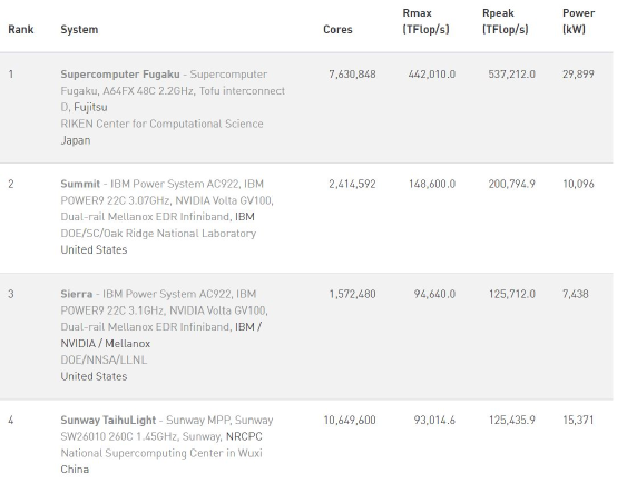 神威太湖之光曾經在TOP500上連續四次排名第一,即從2016年6月到2017年11月。後來它被美國的“頂點”超過,然後美國的“頂點”又被日本的“富嶽”超過,成了現在這樣的格局。