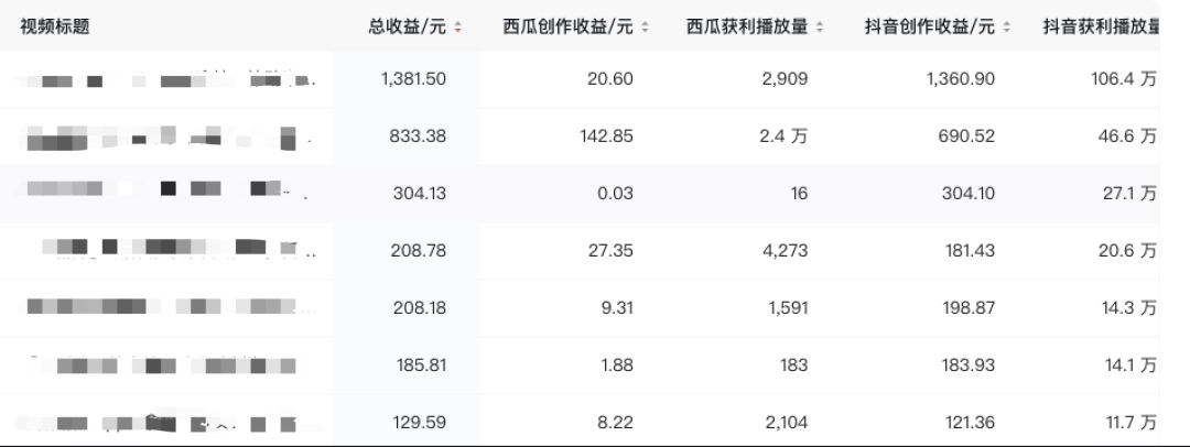 但值得注意的是,儘管收益看起來不錯,根據某娛樂賬號向深燃提供的營收截圖可以看到,其收益絕大部分是來自於抖音分成,比如收益1381元,1360元來自抖音,僅20元來自西瓜視頻,來自西瓜視頻的佔比甚至不到1%。