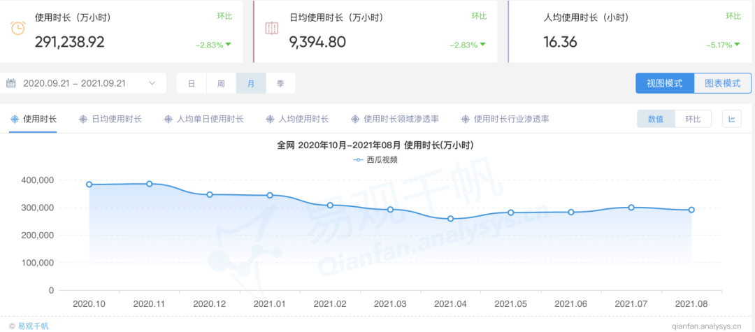 目前,西瓜視頻官方未公佈用户、用户使用時長等數據。但根據易觀千帆數據,從西瓜視頻近一年的數據來看,除了用户量,其在用户使用時長,包含日均使用時長、人均使用時長在內,以及啓動次數上,均有下跌趨勢。尤其是人均使用時長,由2020年10月的一個月24.89小時,到2021年8月,直降到16.36小時,降幅達34%。
