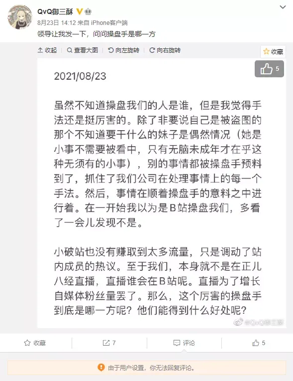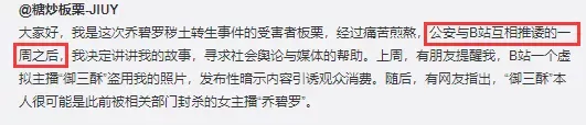 8月16日,微博用户“糖炒板栗-JIUY”發佈了一條長微博,指控B站虛擬偶像“御三酥”多次盜用自己的照片,在外網上建立情色人設,並以此持續謀利……
