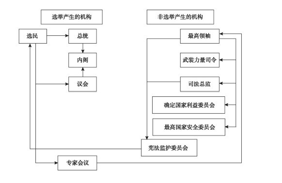 憲法監護委員會由高級教士組成,是伊朗最有影響力的政治機構,對總統和議會決議享有否決權(負責審查議會決議),目的是確保行政與立法符合伊斯蘭教義與《古蘭經》。確定國家利益委員會則是最高領袖的諮詢機構。
