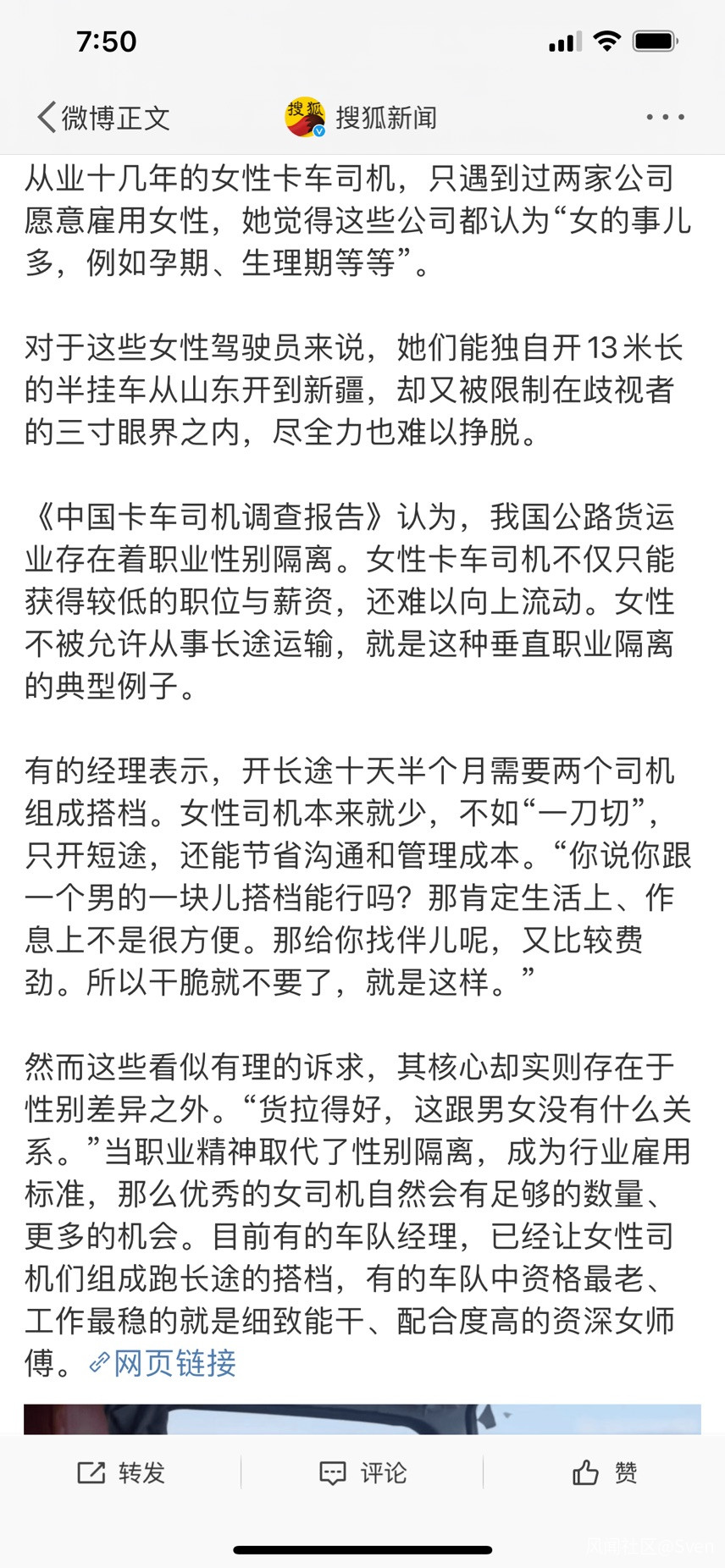 類似這樣的文章寫熟練了就是流水線生產,套路都一樣。但是我也是真的沒想到現在就連卡車司機這種辛苦職業,都能有所謂的“向上流動”。女孩子不被安排和丈夫以外的男性一起開長途車叫“性別隔離”,是社會出了問題。