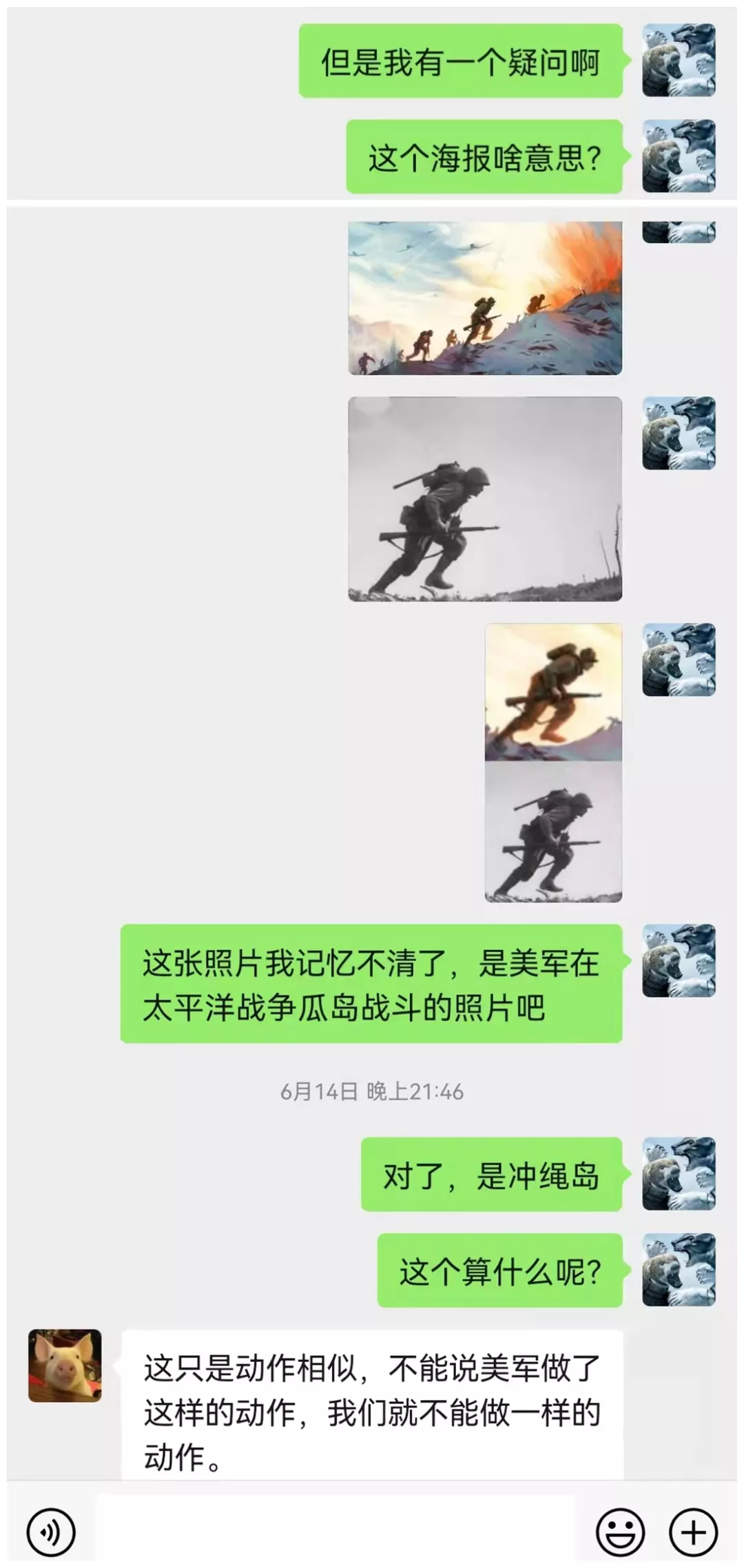抗美援朝戰爭的電影,志願軍的電影,宣傳時説得天花亂墜,説什麼為了紀念我們的前輩,為了紀念前輩的精神,諸如此類云云。結果在宣傳海報中偷偷塞了美軍的元素,如果是普通元素倒也罷了。結果這個元素偏偏是美軍的標誌性照片,還是凸現美國海軍陸戰隊頑強鬥志的著名影像資料。而長津湖戰役中志願軍的對手正是美國海軍陸戰隊1師。
