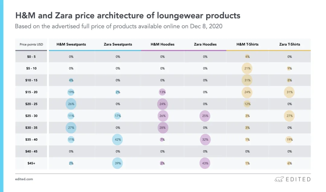 ZARA外套衞衣(hoodies)的價格有超過70%都在35美元以上,H&M則有近80%集中在20-35美元區間。
