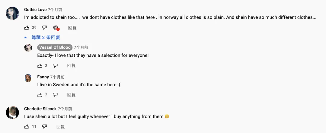 翻譯:我也有點SHEIN上癮了,俺們這嘎達沒有這種衣服,挪威的衣服都特別寡淡,SHEIN的款式好豐富哦。——確實!我超愛的!SHEIN的款式適合每個人。——俺在瑞典,情況一樣。——我每次從SHEIN買完衣服都羞愧得想剁手。