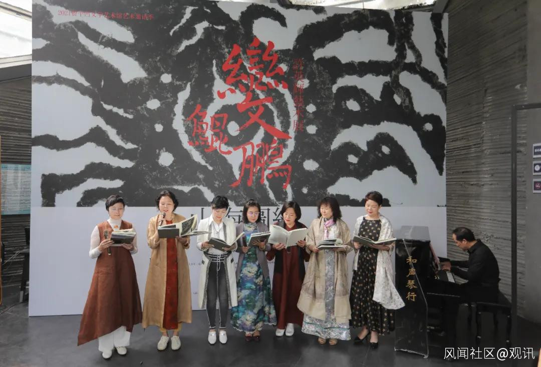 最後,本次展覽的出品人:白家大院董事長李影女士、樹美術館聯合創始人劉霞女士和藝術收藏家吳谷豐女士對所有嘉賓的到來表示了誠摯的感謝。三位出品人邀請“山海圖紀”藝術私董會其他成員:藝術收藏家、企業管理諮詢導師朱俐安女士、吉利爾潞綢集團董事長王淑琴女士、山東水發岱瑞公司董事長李寧女士、薇妮體雕中國區副總經理徐文鵬女士及陝西省交響樂協會會長李夏河先生共同朗誦詩歌《鯤鵬9變》。