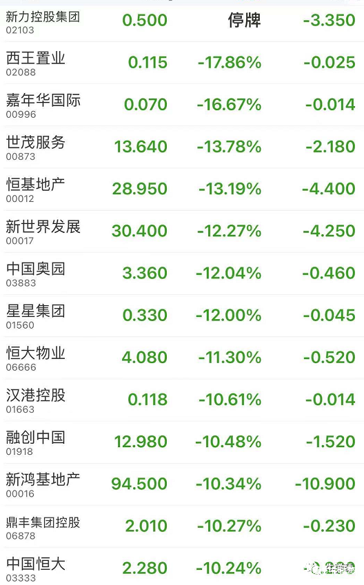 世茂、恆基、新鴻基、融創、恒大,跌幅都是10%起步。