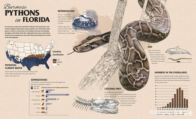 根據科學家推測,美國佛羅里達的緬甸蟒成災,是由於1980年艾倫颶風摧毀了大量的寵物店,使大量的緬甸蟒被釋放到自然環境中。
