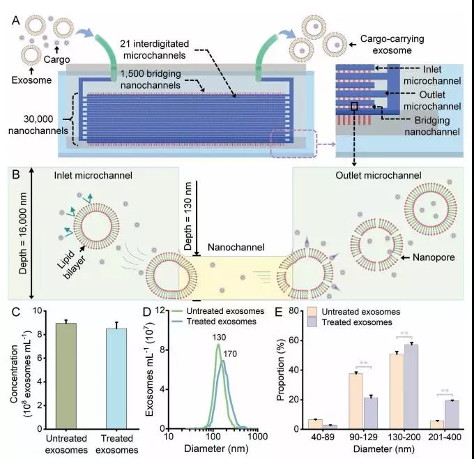 **該方案藉助了微納米流體技術,**實現了 3 萬個並行工作的模塊。通過對外泌體的囊膜直接施加機械擠壓力和流體側向剪切力的“雙重作用”,在外泌體的膜表面產生短暫存在、不破壞生物膜結構的納米孔。