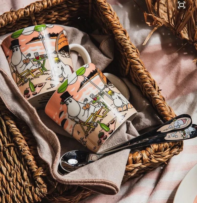 比如,百年芬蘭家居品牌Muurla多年持續推出姆明季節限定系列,2020年的夏季限定杯子,杯麪畫的是在海邊度假的姆明一家。“去海邊”向來是大家對於夏天的期待, 淡淡的橙色,彷彿夏日的火燒雲晚霞,沙灘、果汁啤酒,畫面營造了濃厚的夏日氣息,擁有它彷彿就擁有了屬於自己的愉快夏日。
