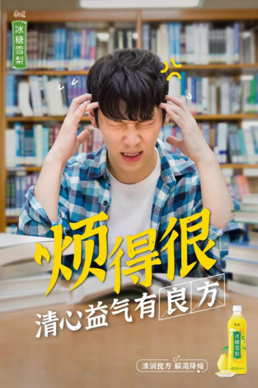 康師傅則曾花大力氣宣傳冰糖雪梨的秋季使用場景,使用一系列的場景海報、短視頻,強調秋季人們容易感到“煩、悶、幹、躁”,宣傳冰糖雪梨獨有的“解渴降燥”功效。