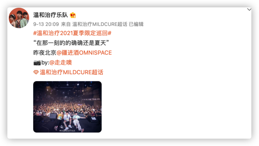 小眾國內樂隊“温和治療”樂隊則以夏日限定為主題,開展巡迴演唱會。巡演名稱為“再飲綠豆冰”;演出的時間為從9月到10月,夏末的最後一小段時間;甚至宣傳的微博文案也都在強調夏日,營造了強烈的夏日限定氣息。