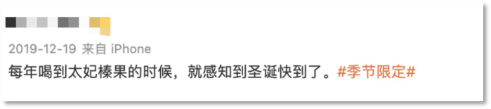 許多中國的茶飲品牌普遍喜歡使用這一營銷方式(如喜茶、奈雪的茶),其實源於消費者們的飲食習慣。不像美國很多超市都喜歡賣凍乾的蔬果,對於中國人來説,蔬果要吃當季的、新鮮的,這是我們一直以來的飲食傳統。從這一層面來説,即使在高科技、發達的農業技術已經能實現幾乎所有水果蔬菜全年供應的今天,圍繞蔬果進行的季節營銷之所以不令消費者反感,就是因為某種程度上它已經不算是一種刻意營銷,而更具有天然性。就是要到楊梅季我們才能吃到好吃又便宜的楊梅,就是要當秋天我們才有香味最醇厚的桂花。所以秋天上新的桂花拿鐵咖啡,桂花烏龍,栗子甜品等,才最具有吸引力。