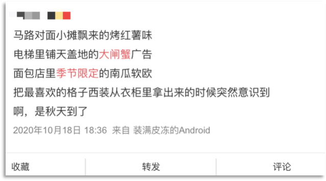 所以我們看到,除了桂花,栗子、石榴、秋梨、大閘蟹、銀杏……幾乎所有秋天的時令鮮花和食物都可以被各大企業品牌拿來大做文章。